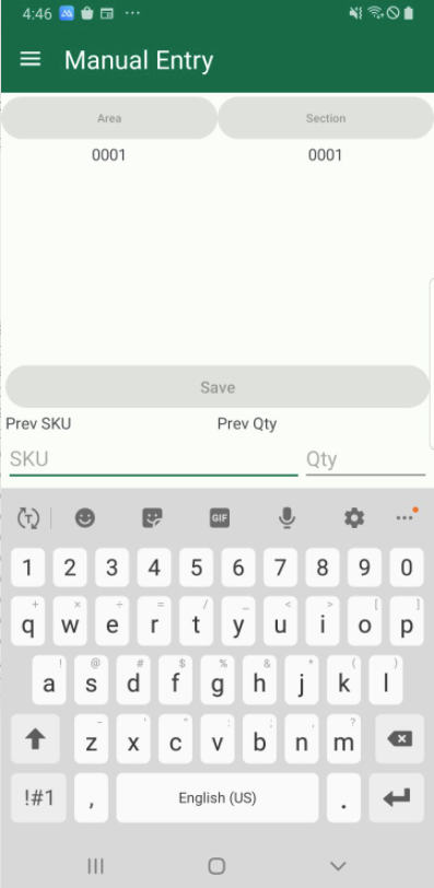 On this screen you an enter all your SKUs and quantities using the device's keyboard. Optionally, you can also use an external keypad.