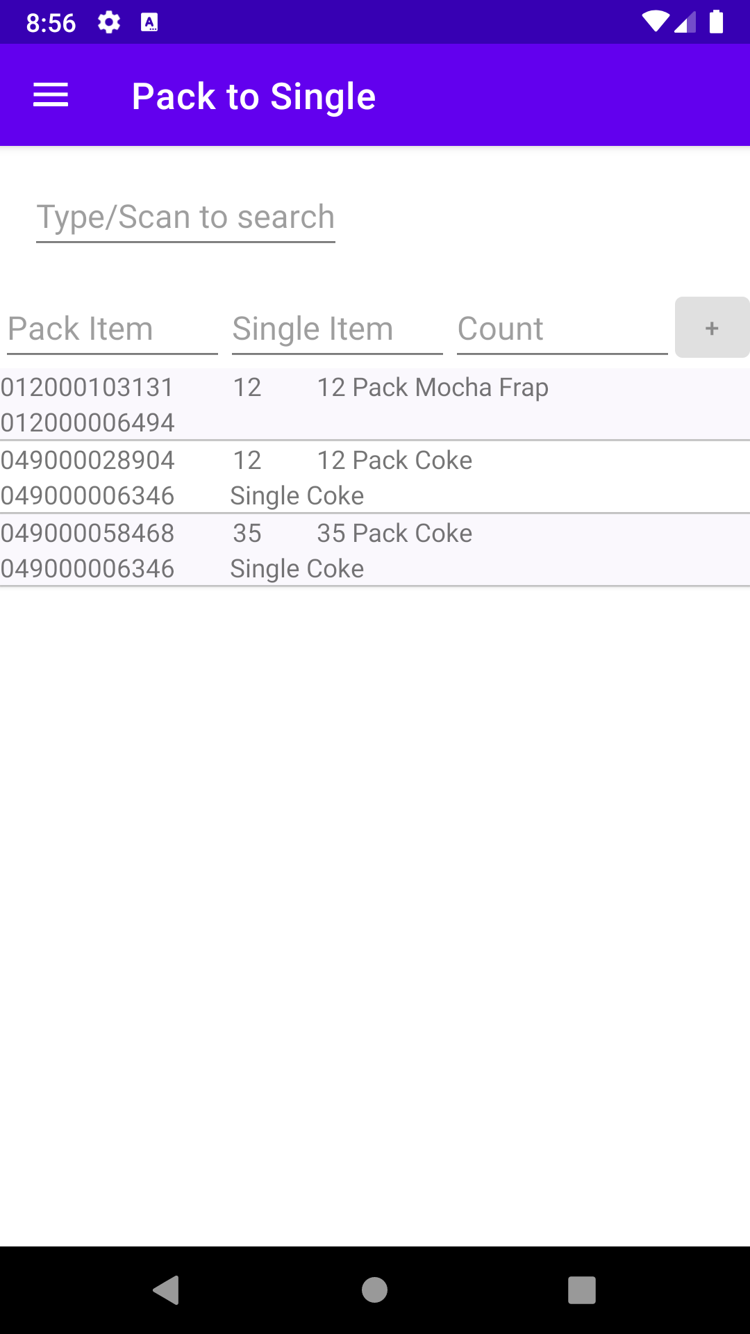 The list shows the pack item, pack item description, pack count, single item, and single item description.